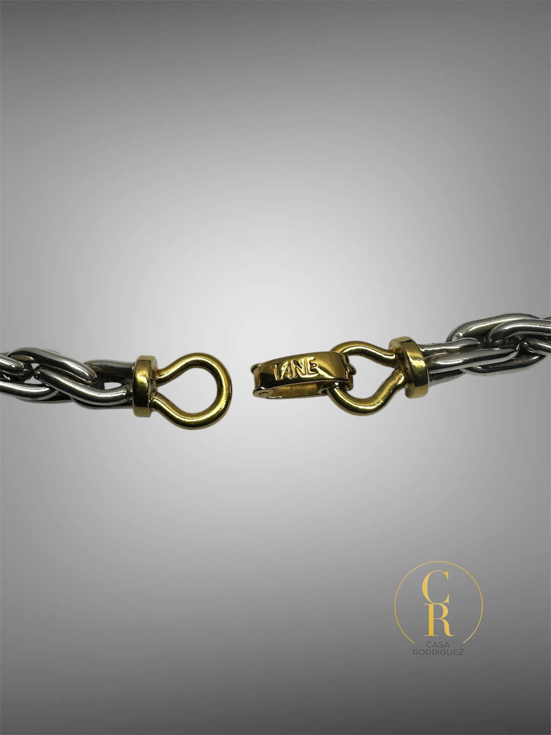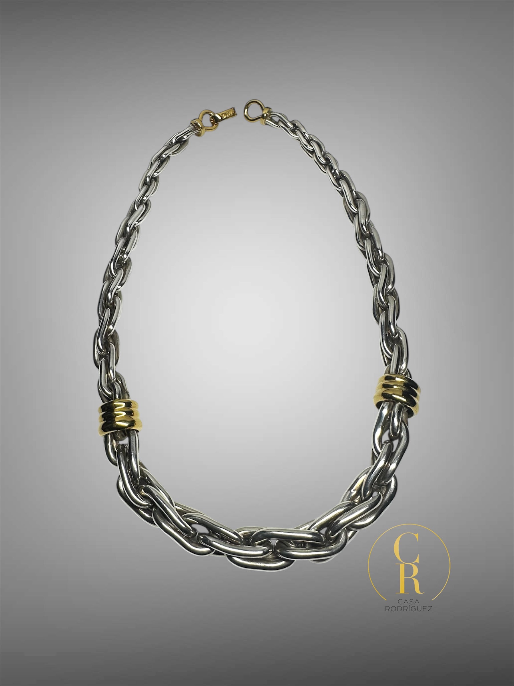 Elaborado en plata esterlina 925, su diseño de eslabones de gran formato proyecta fuerza y sofisticación , cuenta con detalles en baño de oro de 21 quilates lo que le dan un toque elegante a la pieza. se encuentra en buenas condiciones y cuenta con los sellos autenticos de la marca.